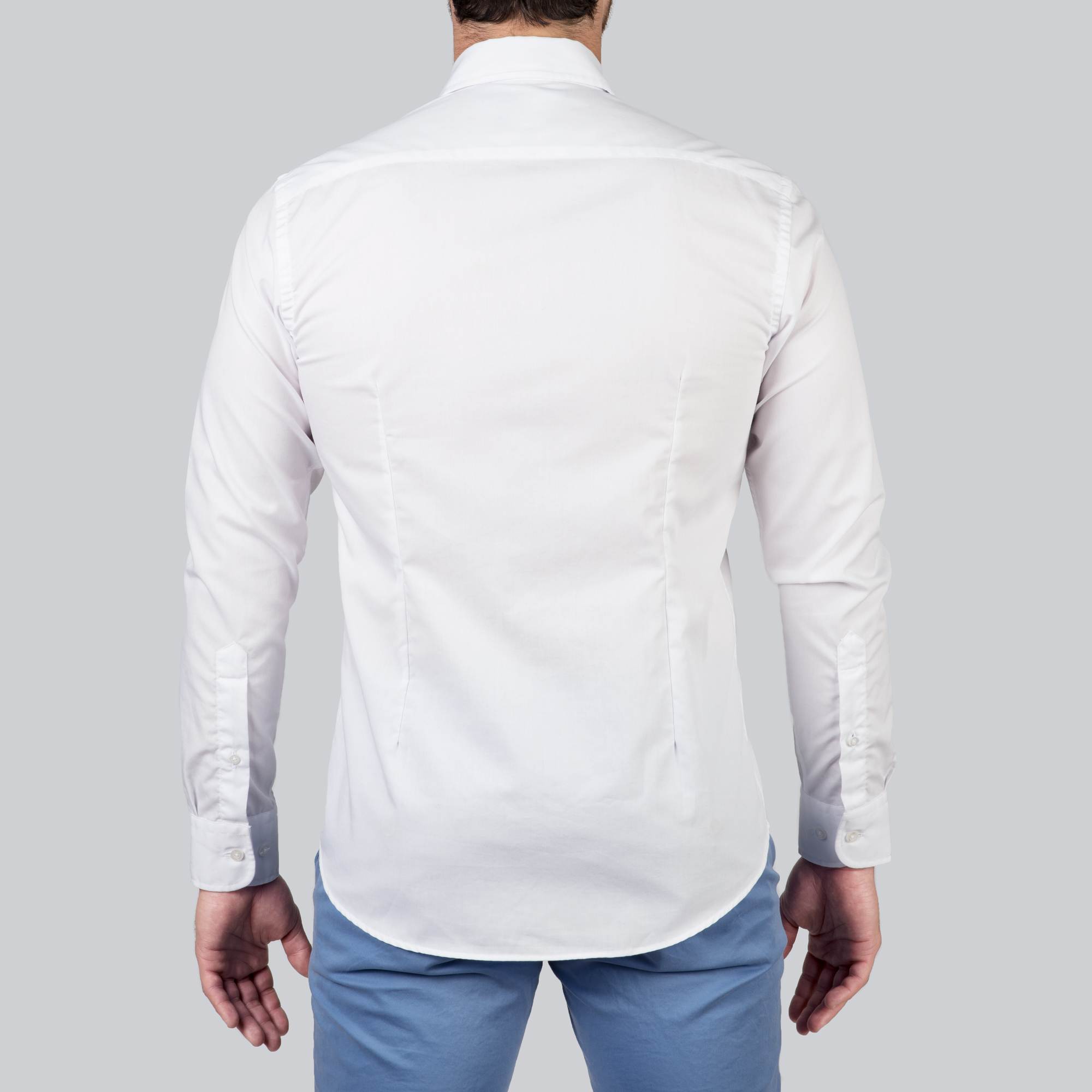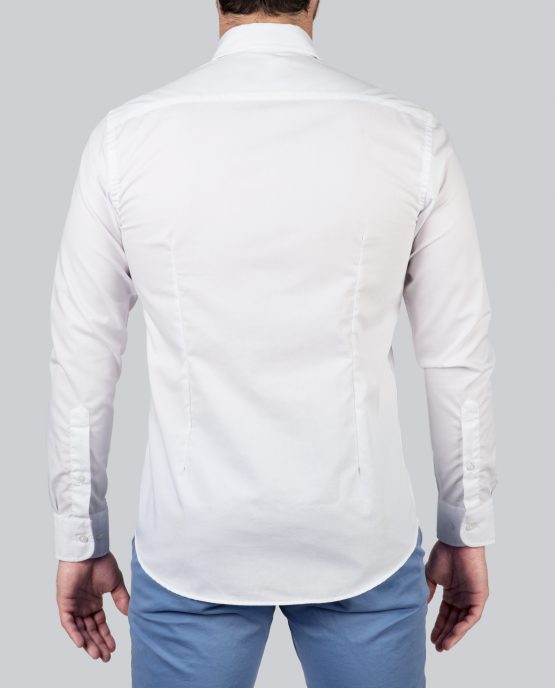 Cette chemise à une coupe slim. Avec deux pinces dans le dos qui peuvent être décousues si besoin pour plus d’aisance.