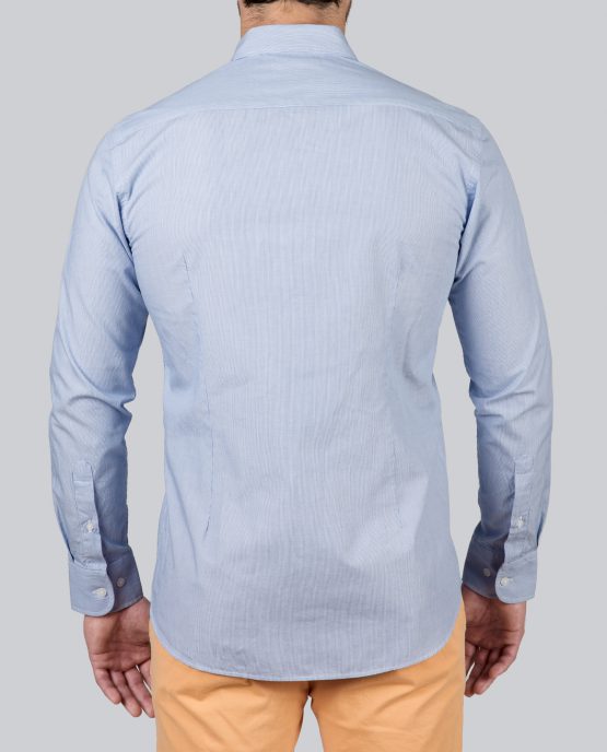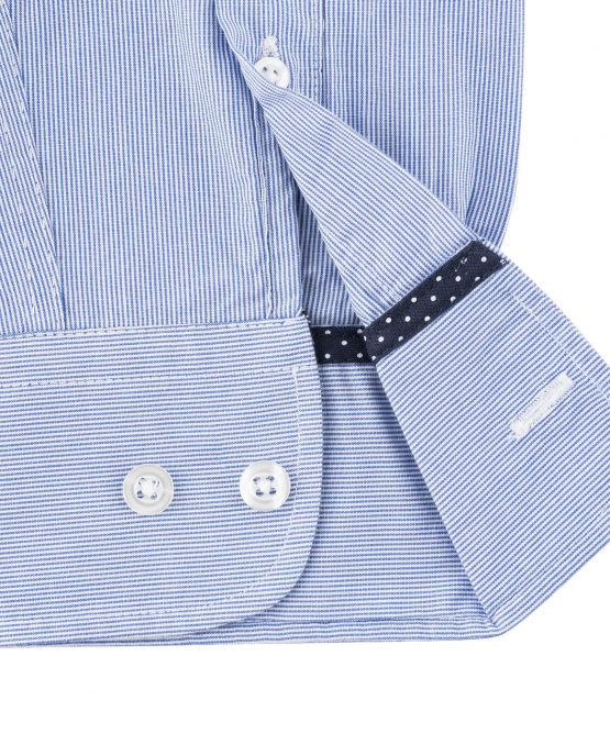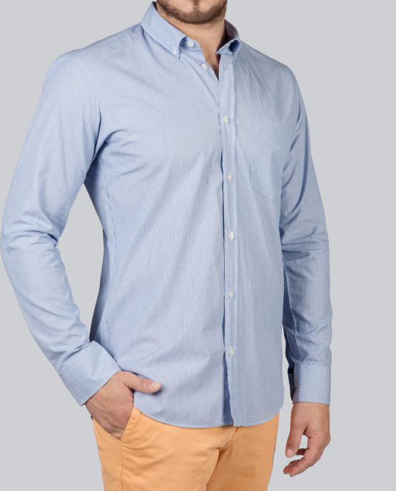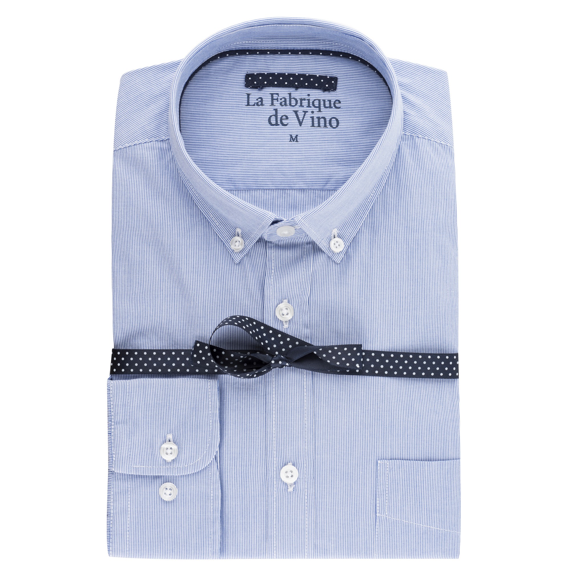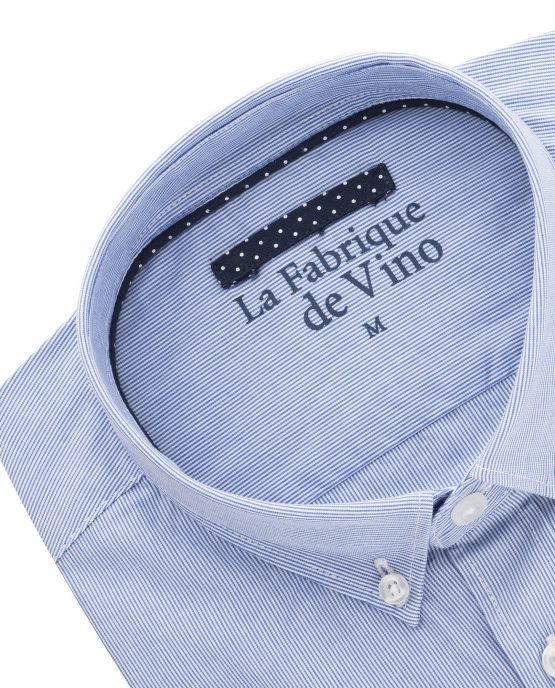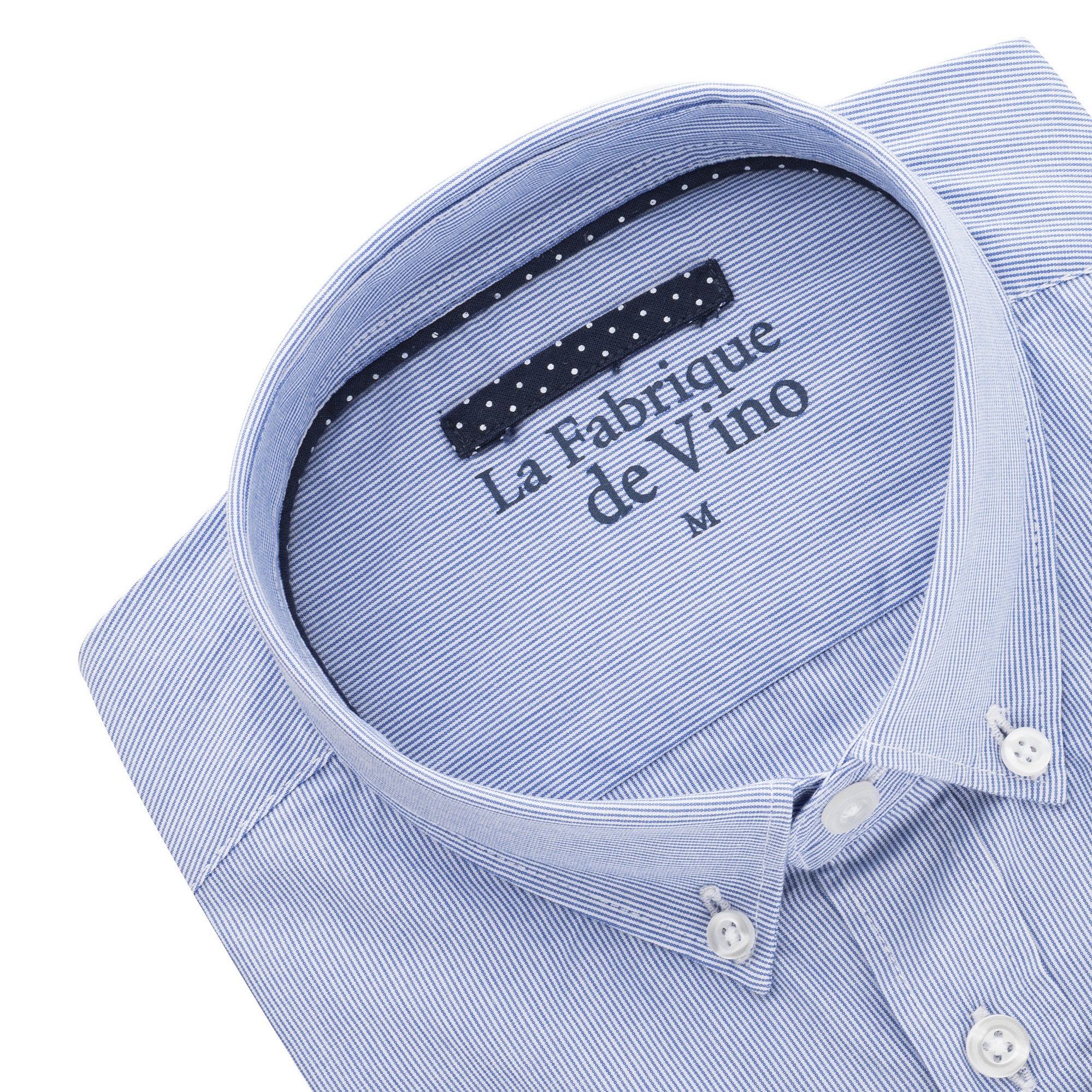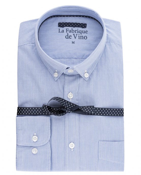 Une chemise à fines rayures col pointes boutonnées en 100% coton comme la plupart de nos chemises. Elle e été lavée pour faire en sorte que son toucher soit fluide.