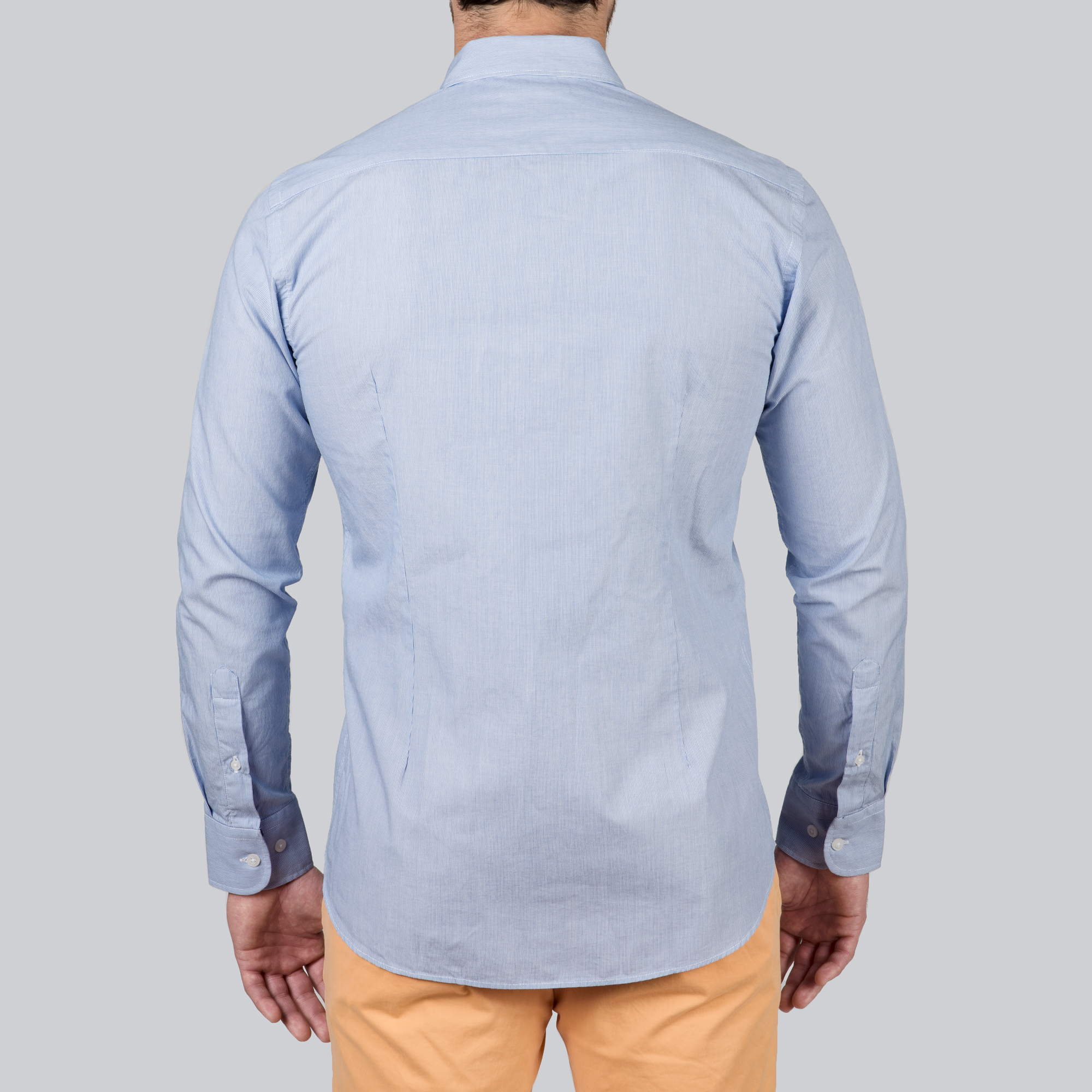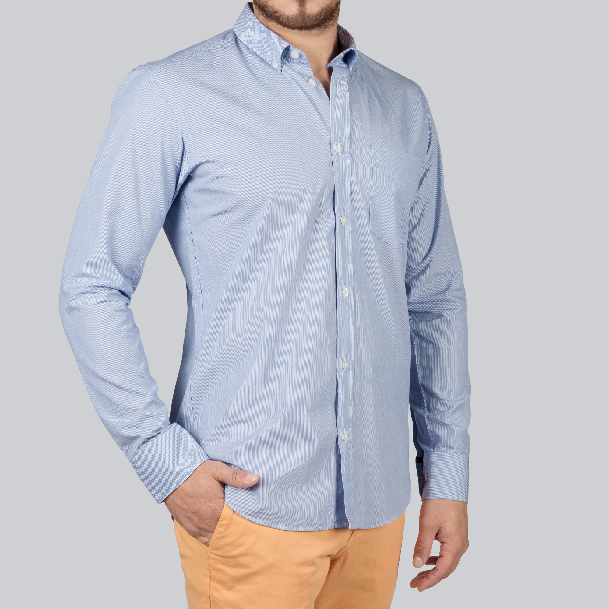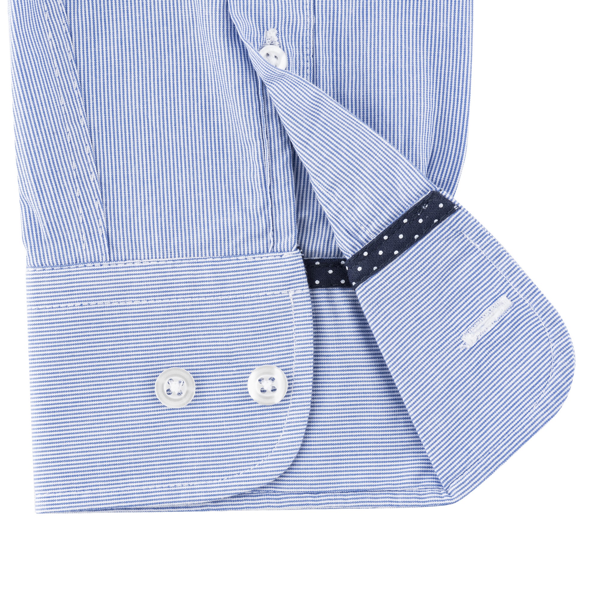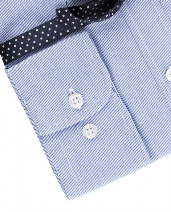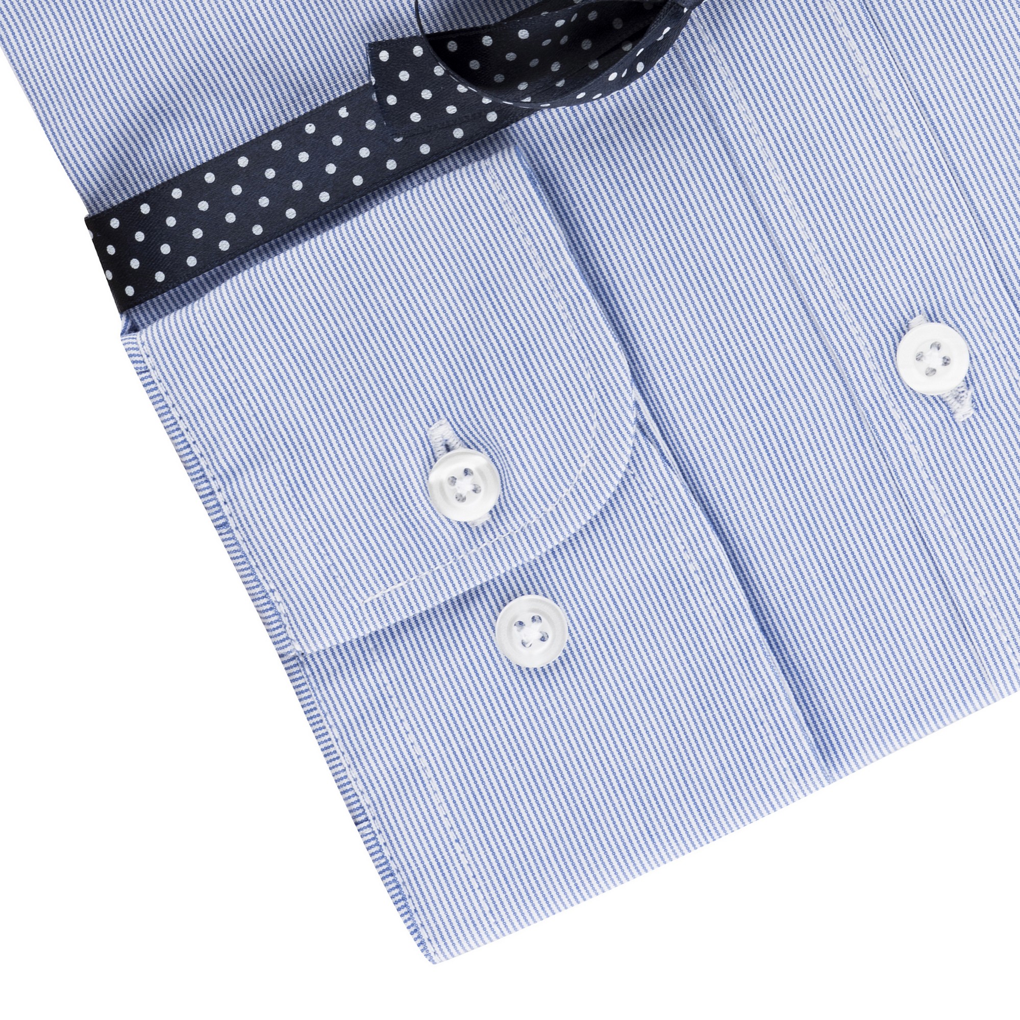 Une chemise à fines rayures col pointes boutonnées en 100% coton comme la plupart de nos chemises. Elle e été lavée pour faire en sorte que son toucher soit fluide.