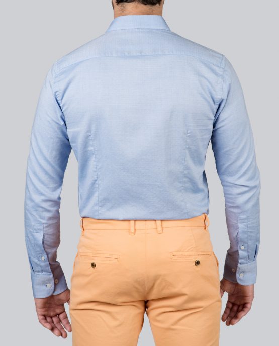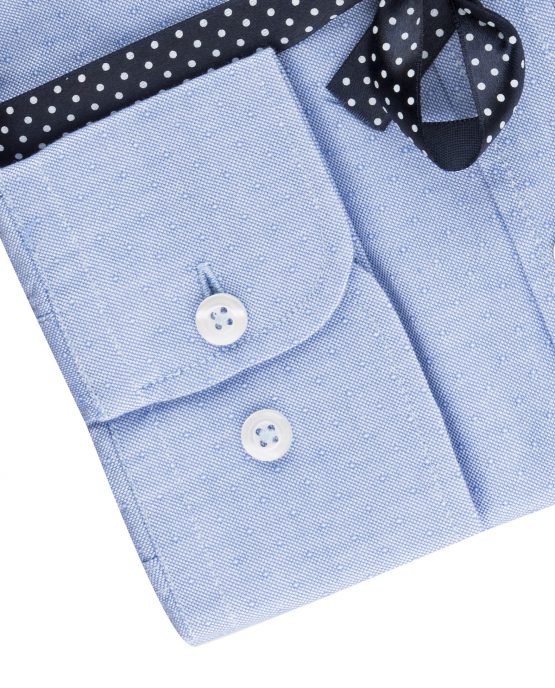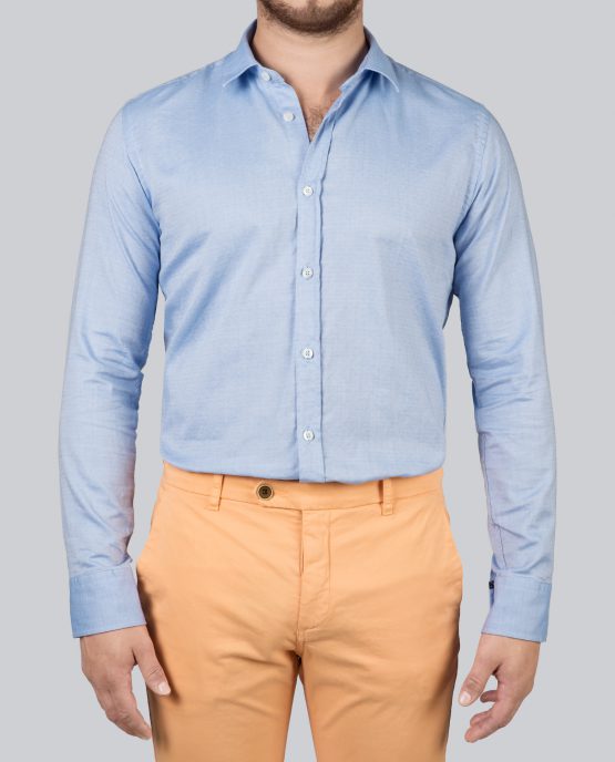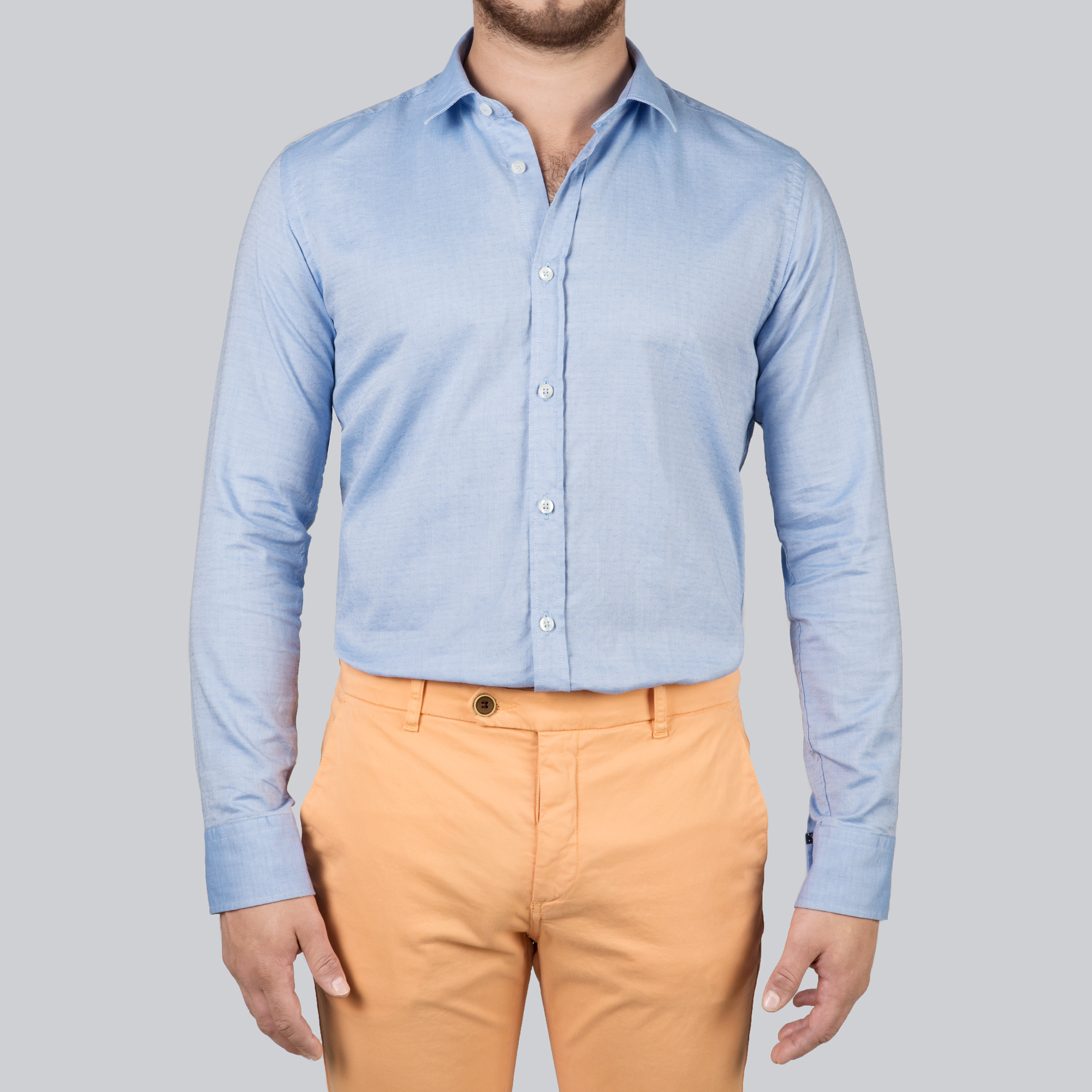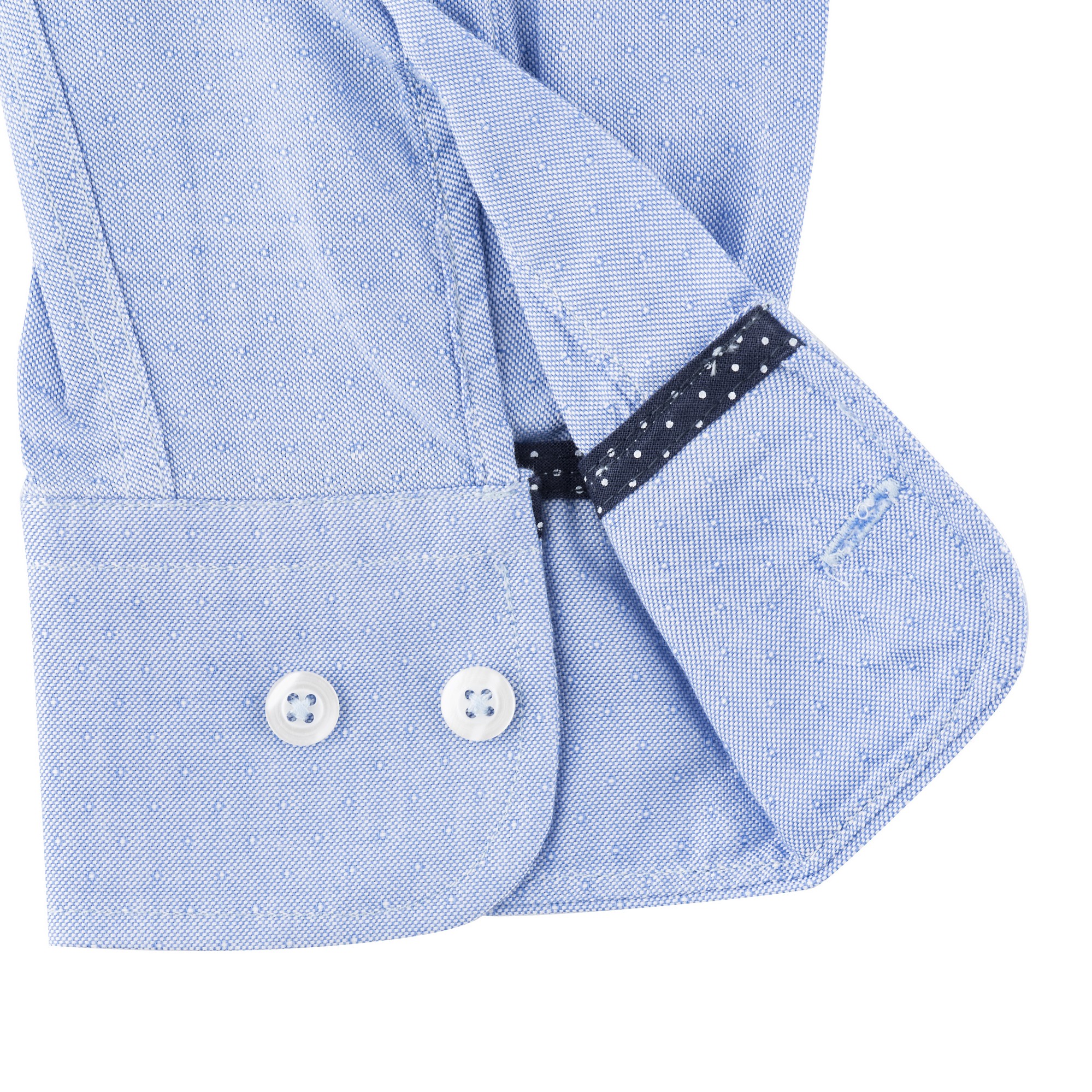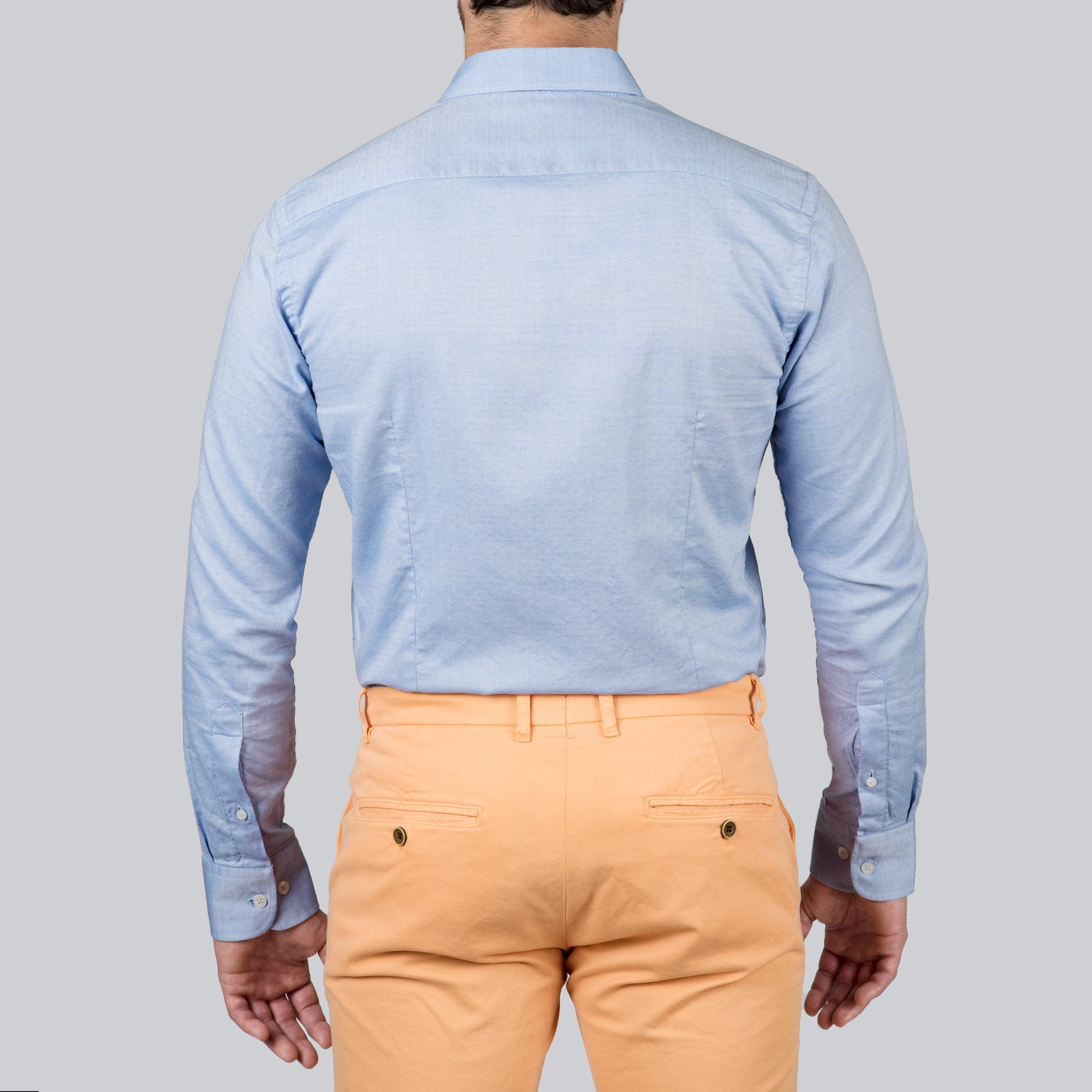 Voilà une chemise bleu ciel à motifs cousus col souple en 100% coton. Et lavée pour une meilleure fluidité.
