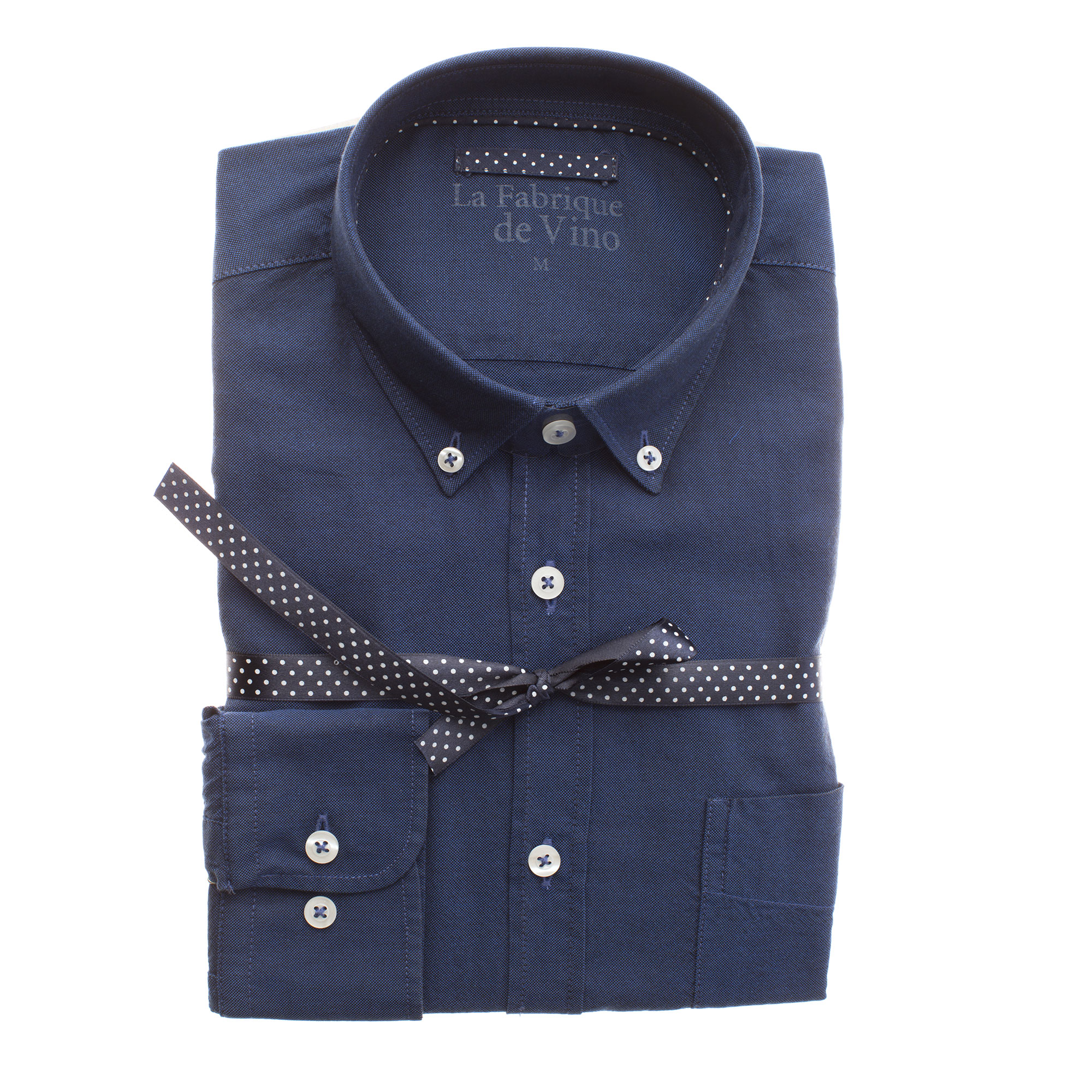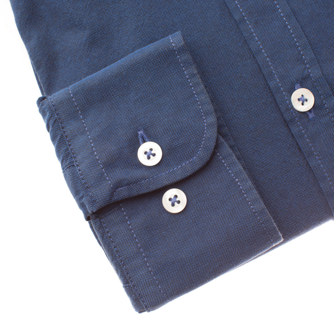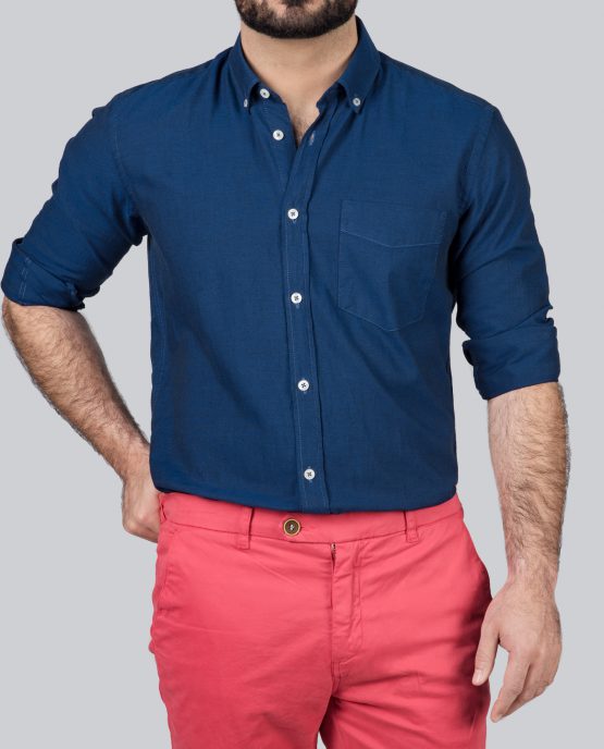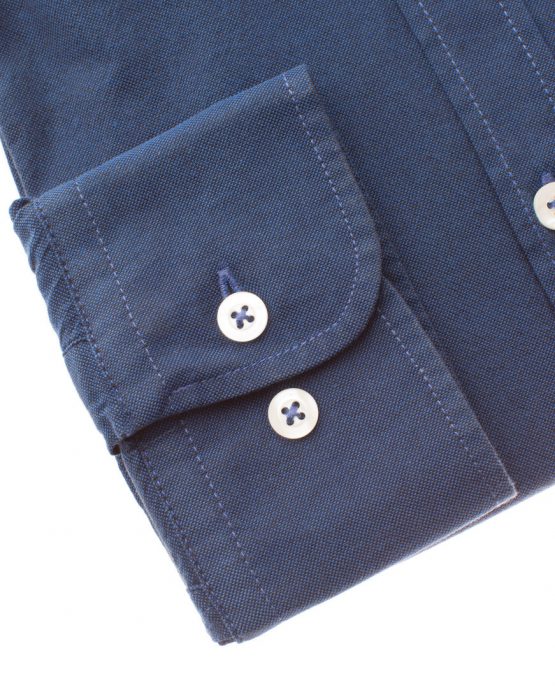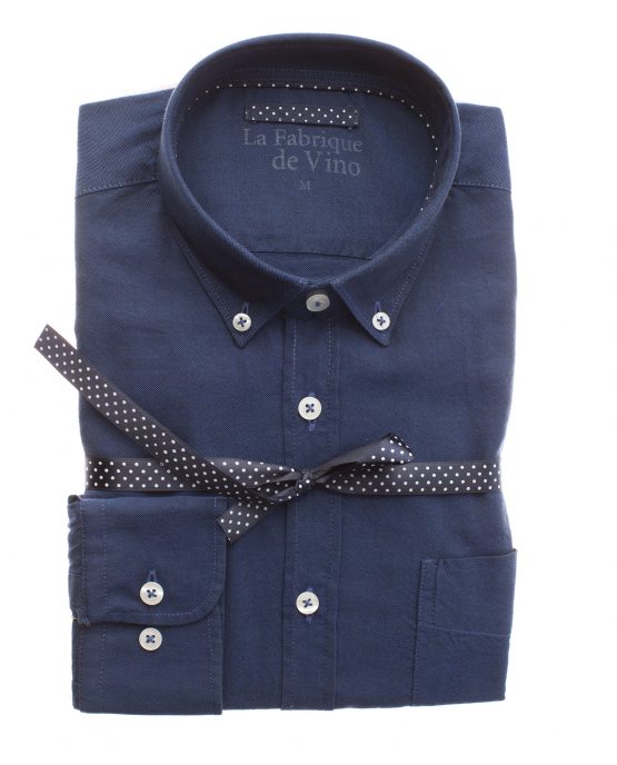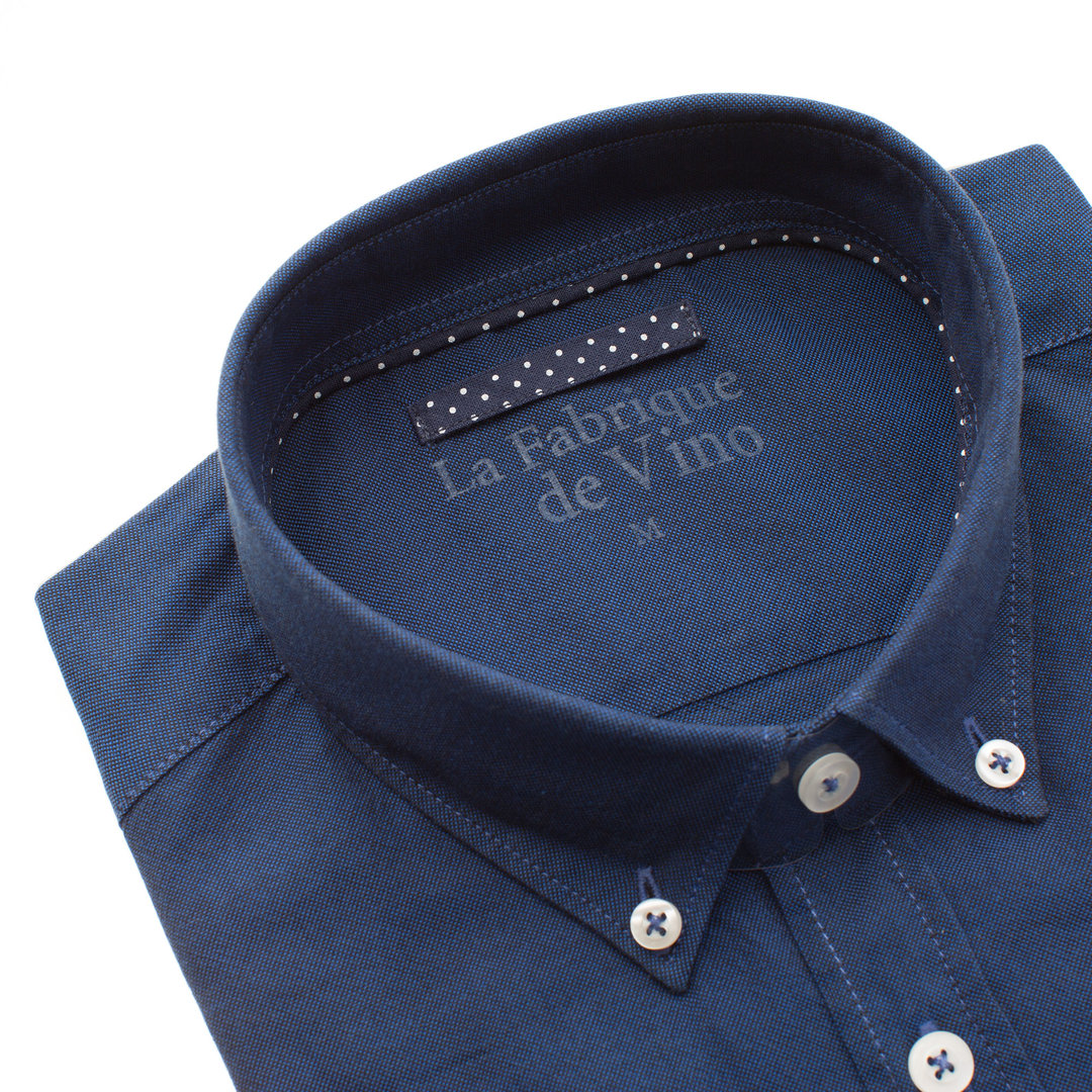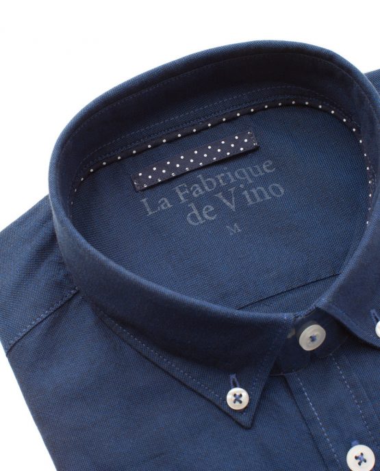 Une chemise en oxford marine col pointes boutonnées dont le tissus en 100% coton est assez épais et à un toucher granuleux.