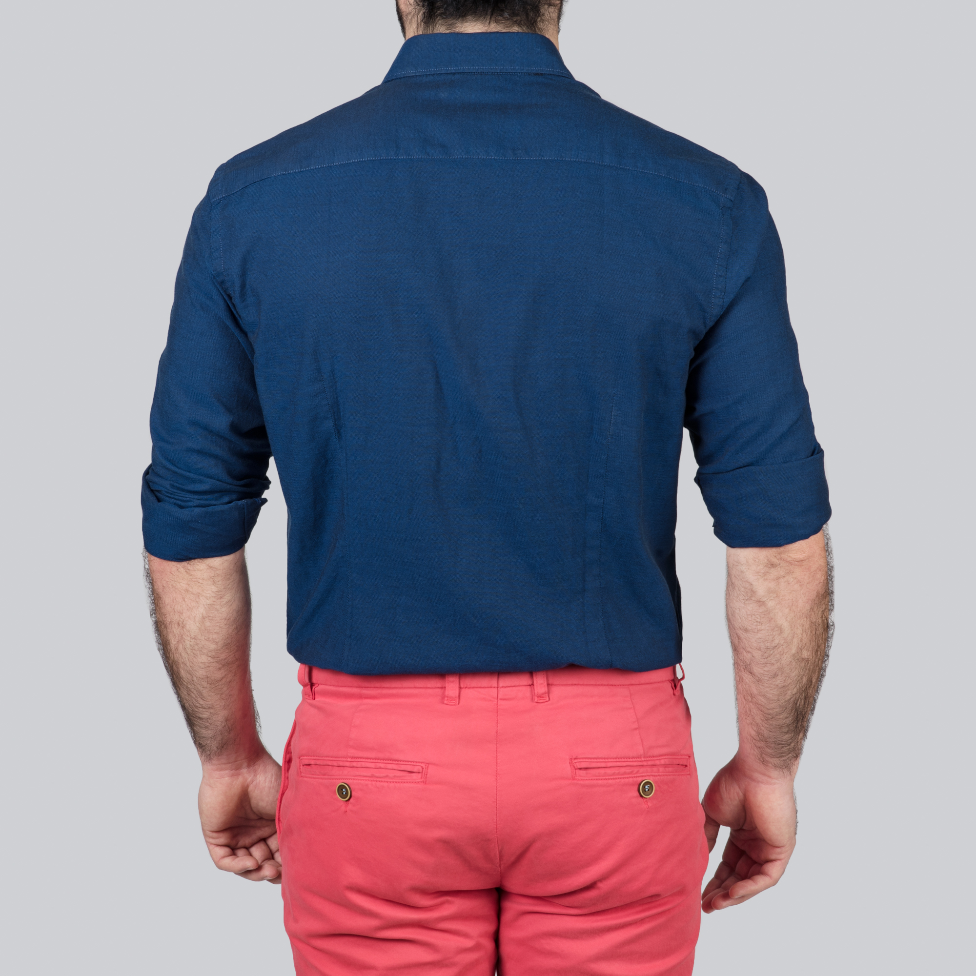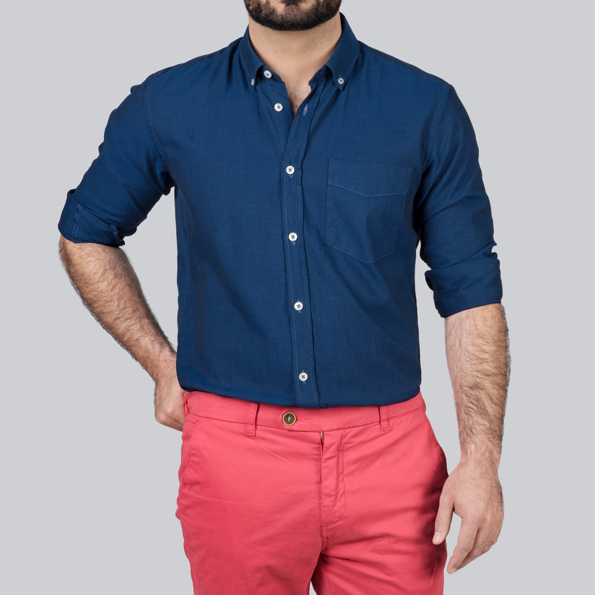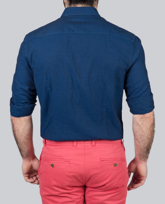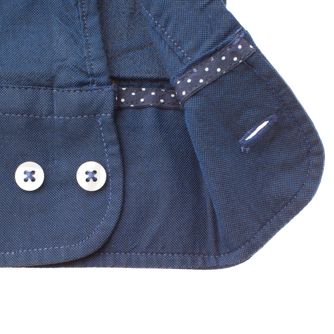 Une chemise en oxford marine col pointes boutonnées dont le tissus en 100% coton est assez épais et à un toucher granuleux.