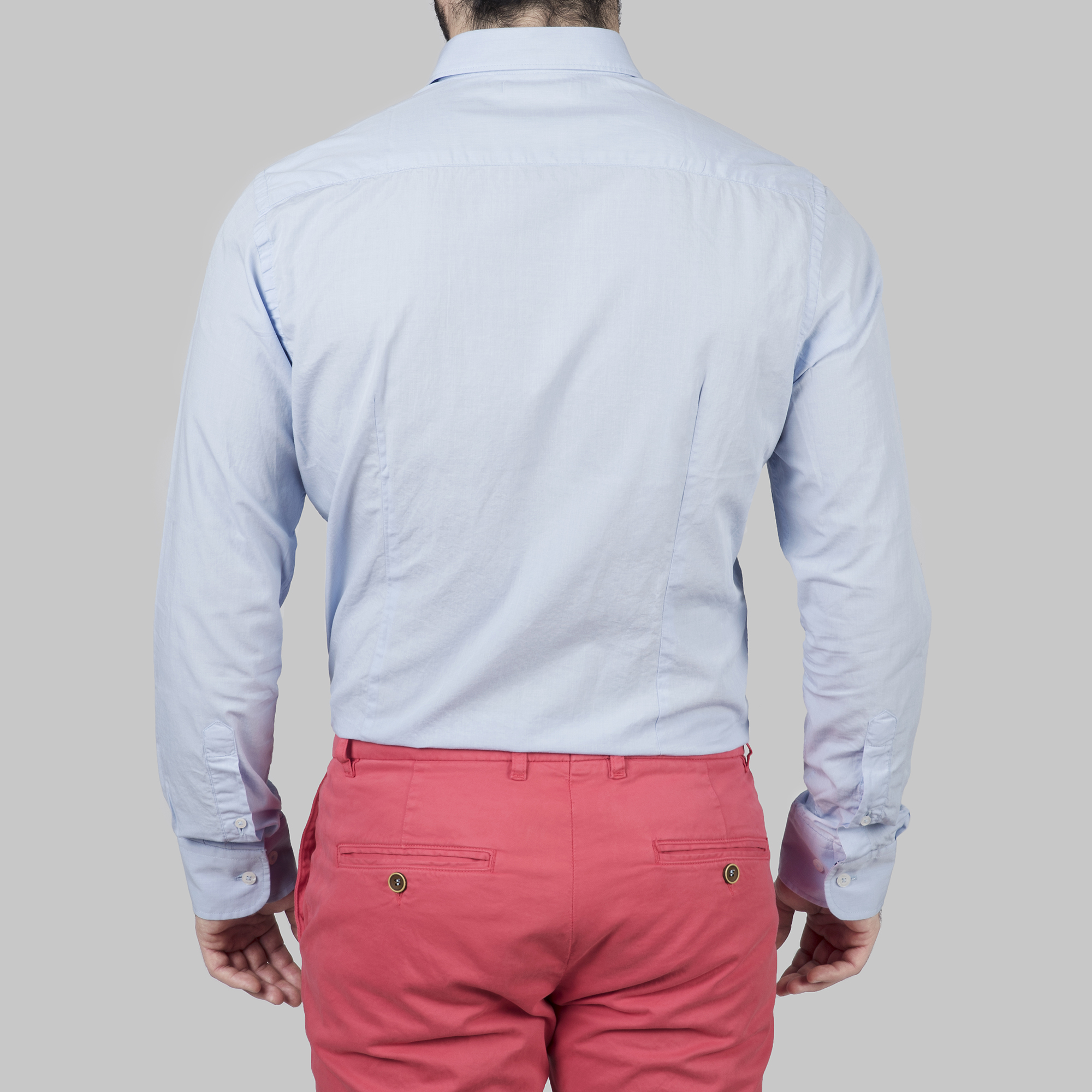 Cette chemise à une coupe slim. Avec deux pinces dans le dos qui peuvent être décousues si besoin pour plus d’aisance.