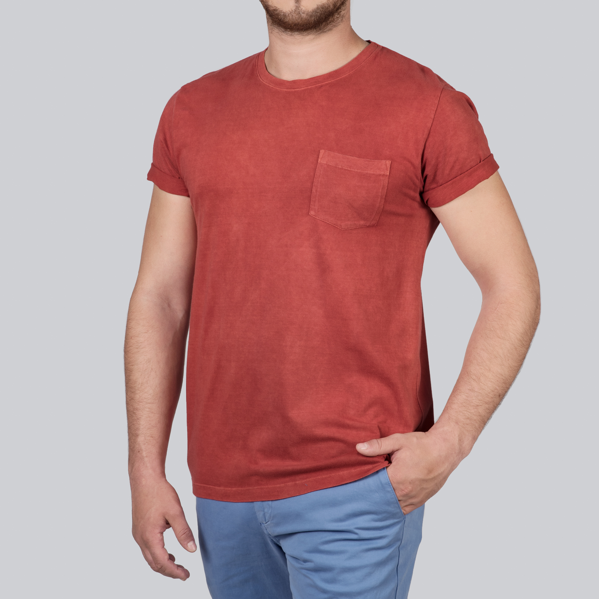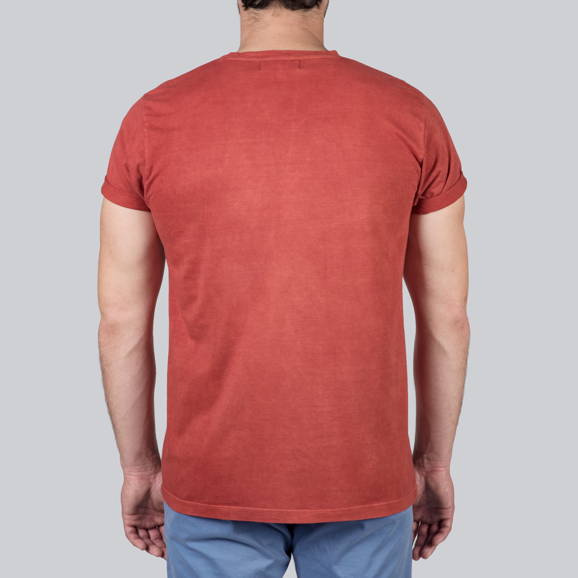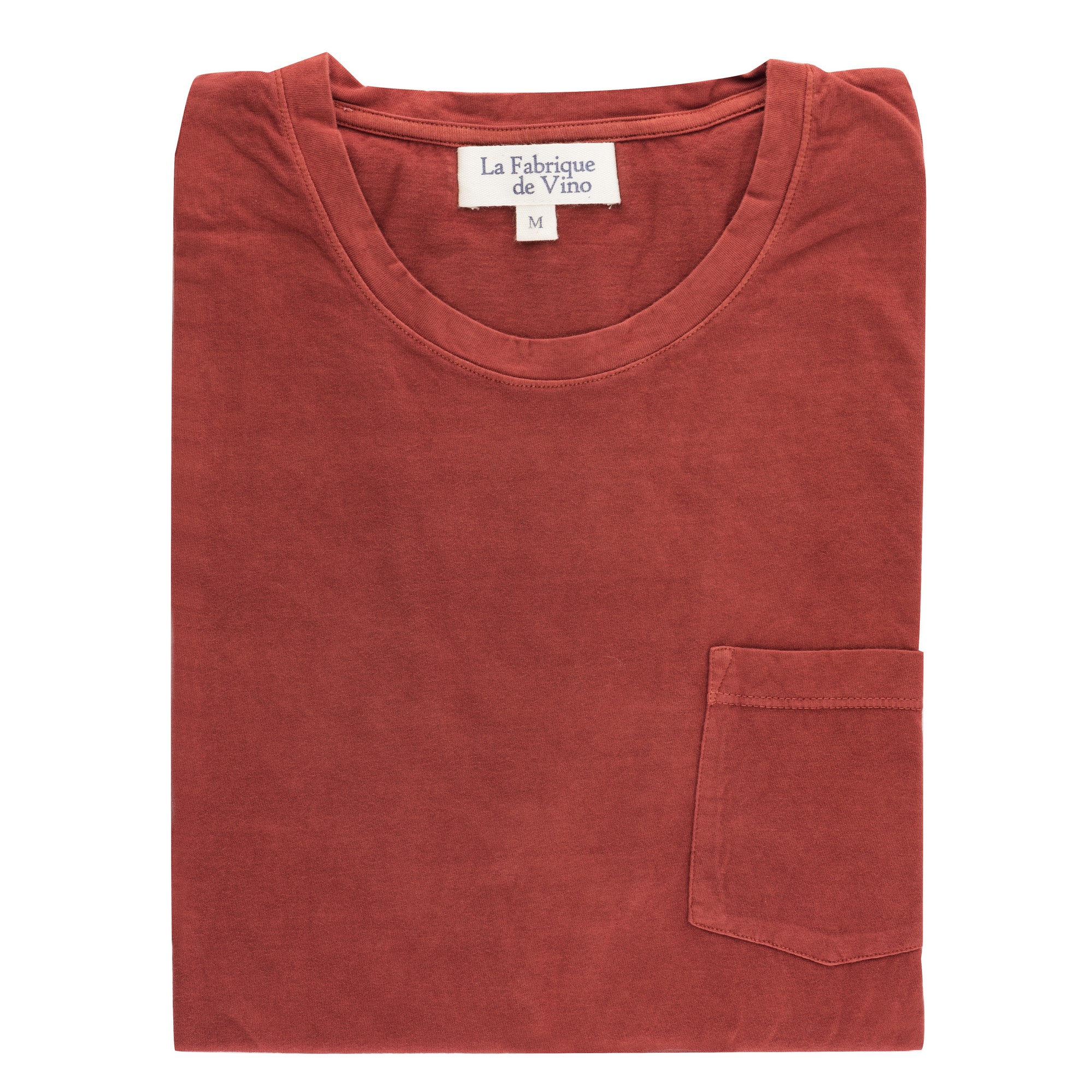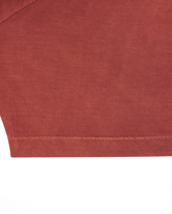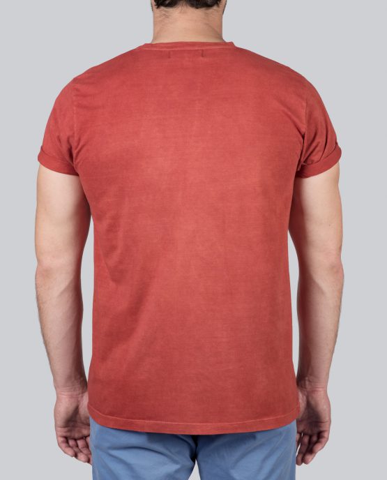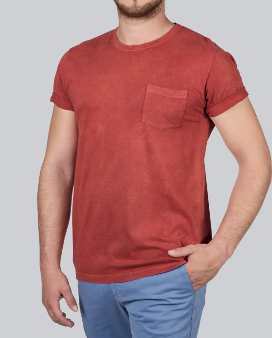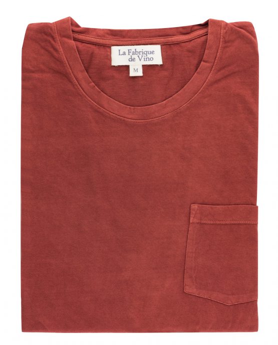 Un t-shirt rouge en 100% coton issu de la culture biologique et durable. La teinture a été faite à la main par des artisans avec uniquement des produits naturels tels que des fruits ou des plantes. Manches courtes, col rond et une petite poche au-dessus de cœur.